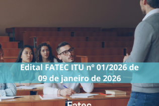 Edital FATEC ITU nº 01/2026 de 09 de janeiro de 2026 A Coordenadoria da Faculdade de Tecnologia Dom Amaury Castanho – FATEC Itu, do Centro Estadual de Educação Tecnológica Paula Souza – CEETEPS,...