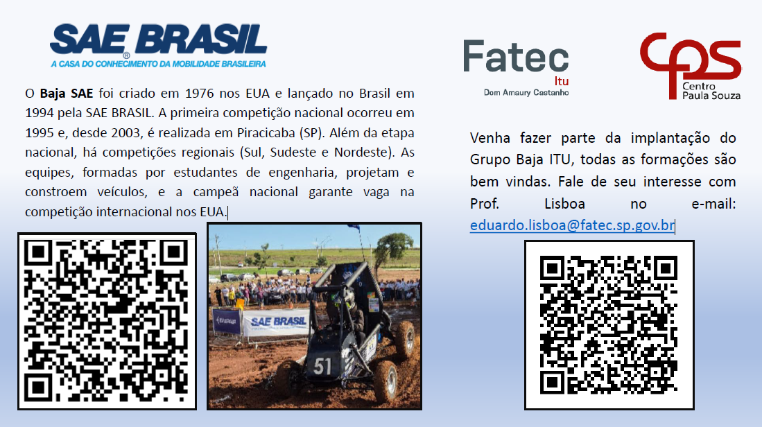👉 Se você é aluno da Fatec Itu e tem interesse em aprender na prática, trabalhar em equipe e se preparar para grandes desafios da engenharia, o Baja SAE é a oportunidade perfeita.