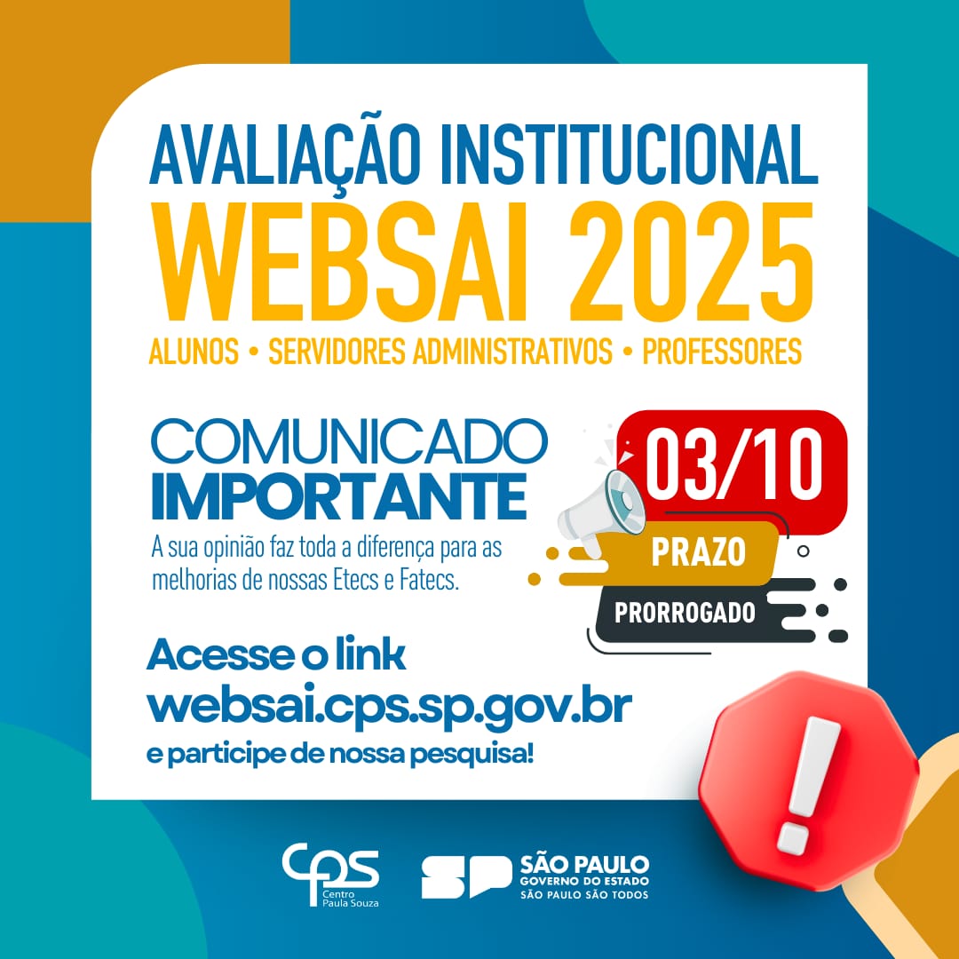 🔹 Avaliação Institucional WebSAI 2025 PRAZO PRORROGADO: 03/10 👉 Sua participação é fundamental!As respostas vão subsidiar ações de melhorias nas Etecs e Fatecs, fortalecendo ainda mais a qualidade do ensino e da gestão. 📍 Participe […]